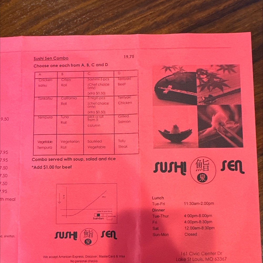 Welcome to Sushi Sen, a hidden gem located at 161 Civic Center Dr, Lake St Louis, MO. This cozy spot offers an array of sushi delights in a casual, family-friendly atmosphere. Their menu features an enticing selection of sashimi, nigiri, and combo options that highlight the freshness of the ingredients.